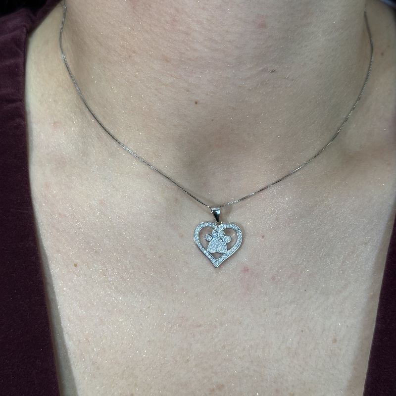 Collana da donna in argento 925 con pendente a forma di cuore con zampetta zirconata . Chiusura a moschettone