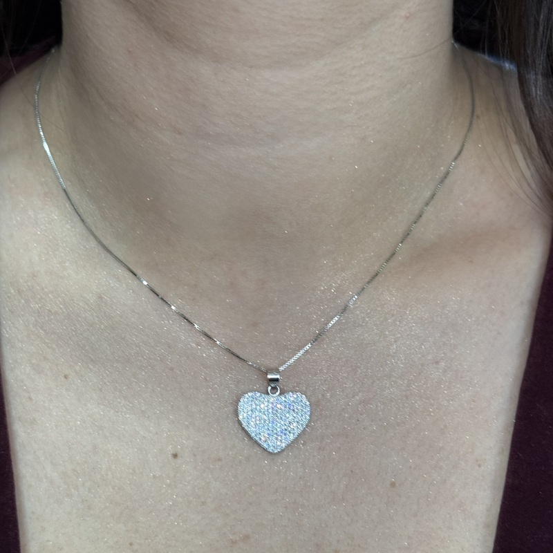 Collana da donna in argento 925 con pendente a forma di cuore tempestato di zirconi. Chiusura a moschettone