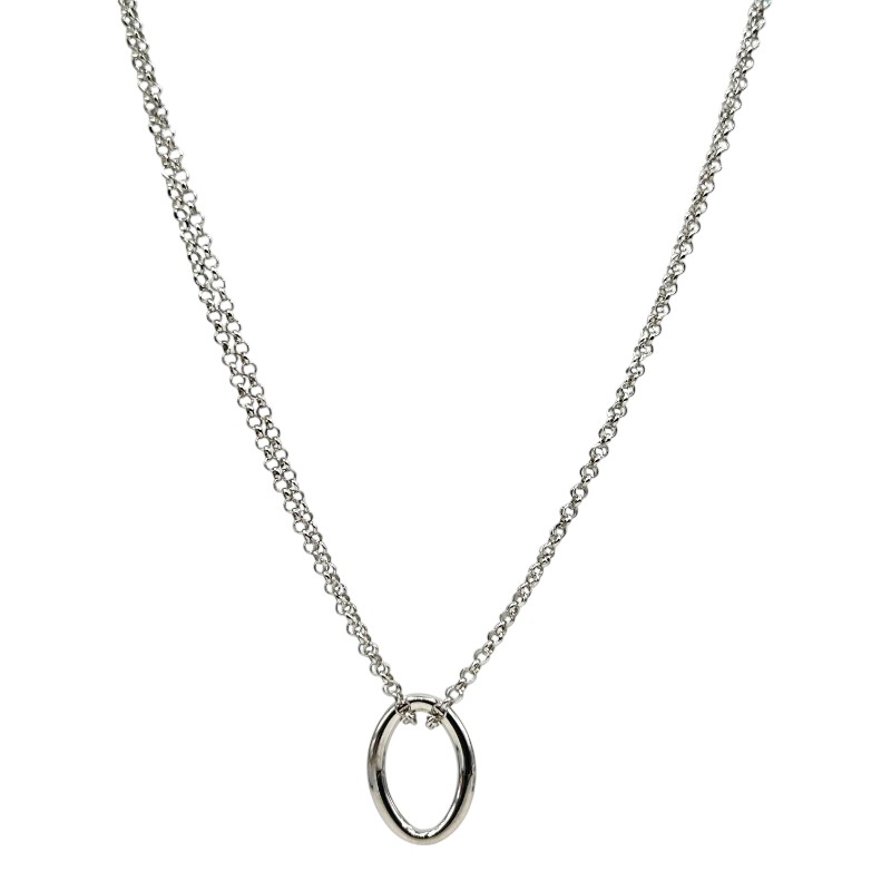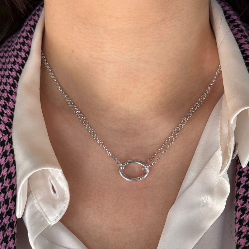 Collana da donna in argento 925 composto da doppia catena rolò e cerchio ovale centrale. Chiusura a moschettone regolabile.12.8