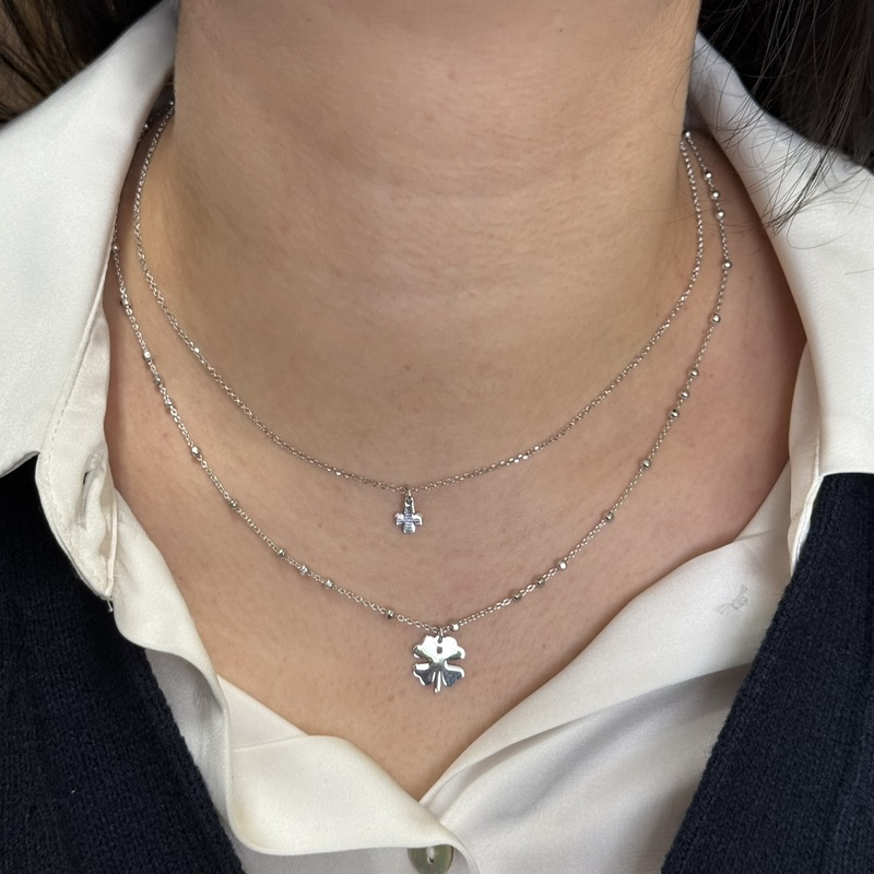 Collana da donna in argento 925 impreziosita da doppio giro di catena alternata a sfere sfaccettate. Doppio quadrifoglio pendente. Chiusura a moschettone regolabile