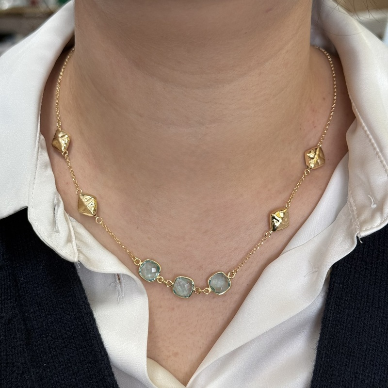 Collana da donna in argento 925 con elementi quadrati e zirconi colorati. Chiusura a moschettone regolabile