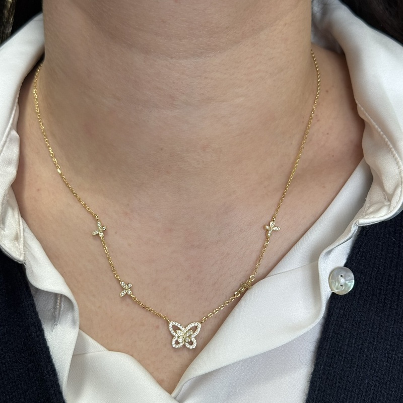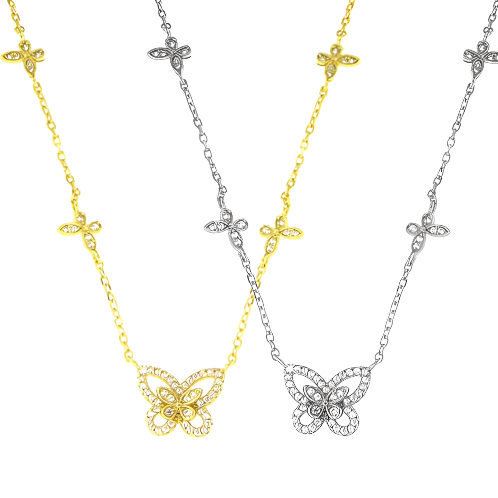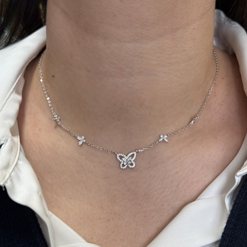 Collana da donna in argento 925 con farfalle e zirconi. Lunghezza 40 cm + 5 cm di allungo