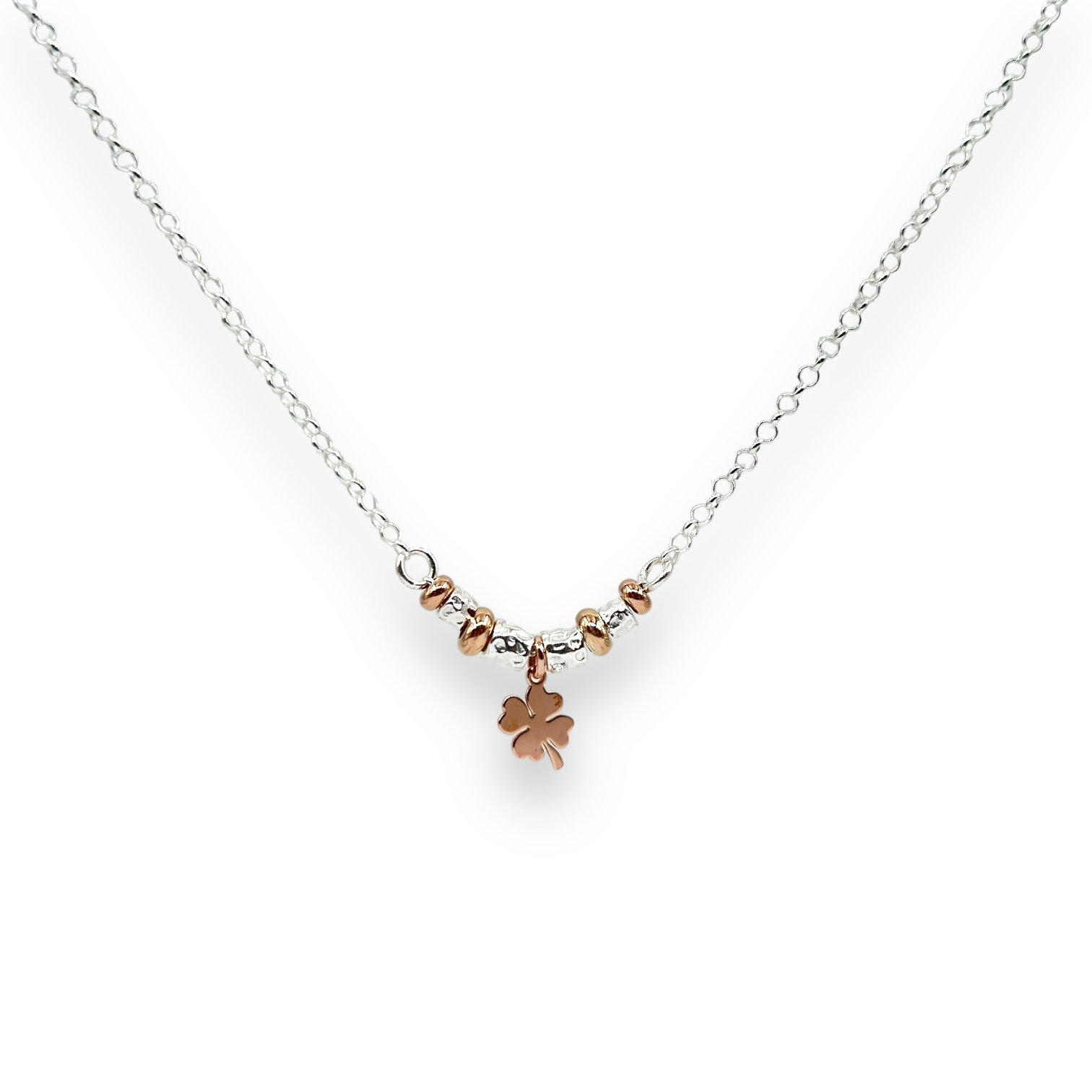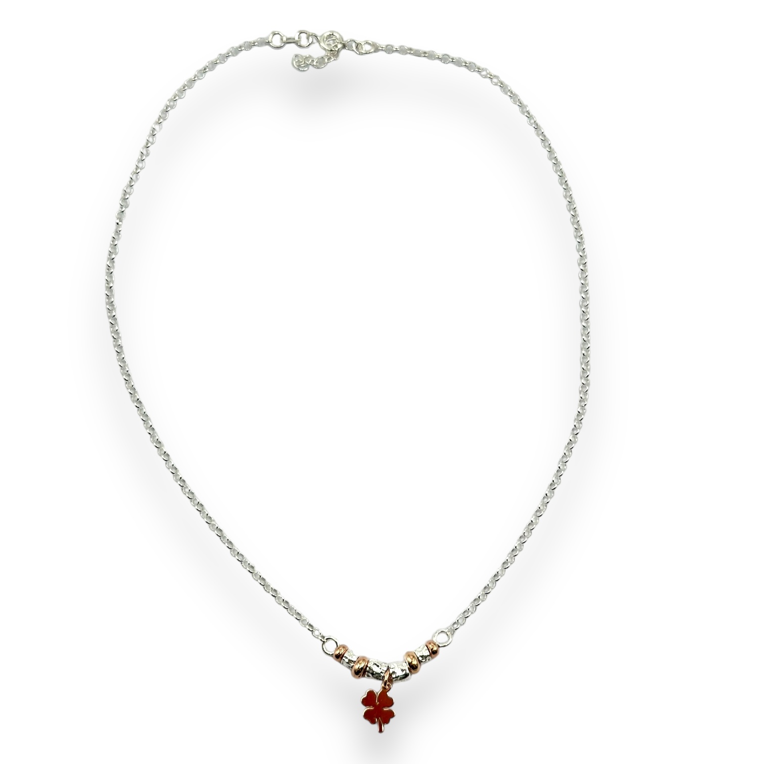 Collana da donna in argento 925 con catena rolò ed elementi pepite e quadrifoglio, lunga 40 cm + 4,5 cm di allungo. Chiusura a molla regolabile