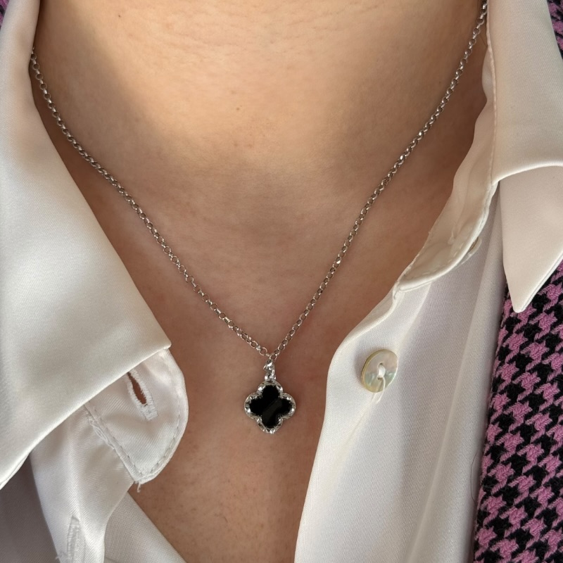 Collana da donna in argento 925 con quadrifoglio fantasy pendente. Chiusura a moschettone regolabile