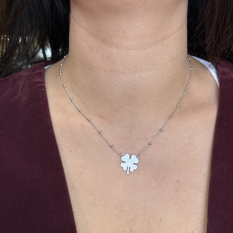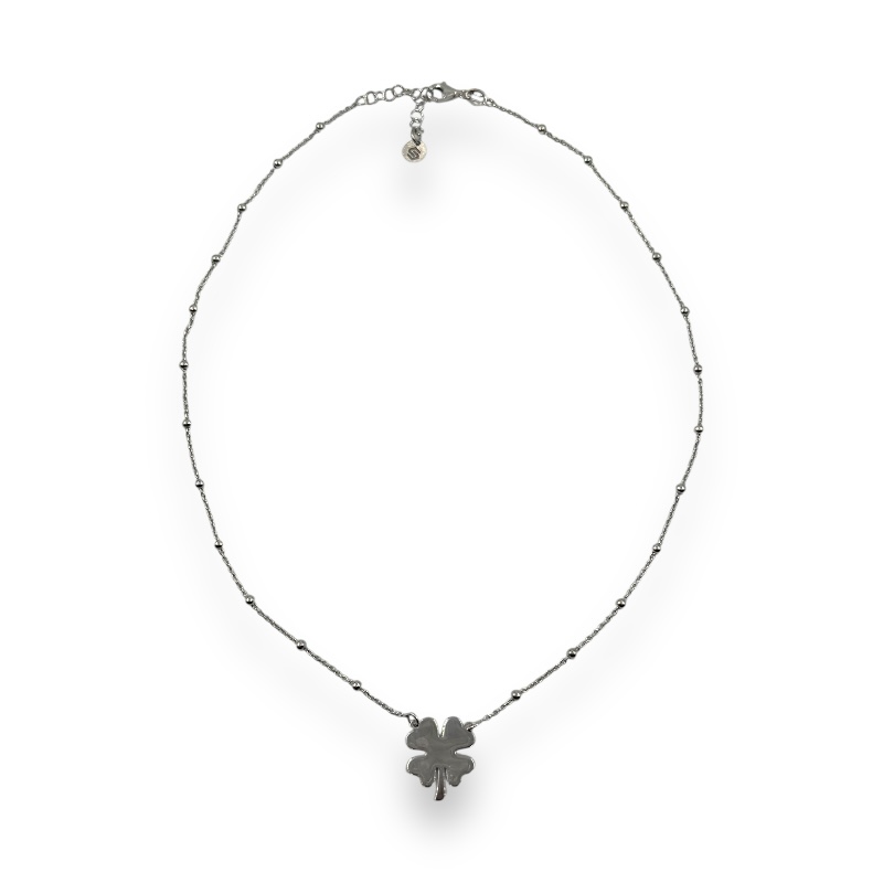 Collana da donna in argento 925 con catena veneziana alternata con palline, lunga 40 cm + 4,5 cm di allungo e pendente a dorma di quadrifoglio liscio. Chiusura a moschettone regolabile