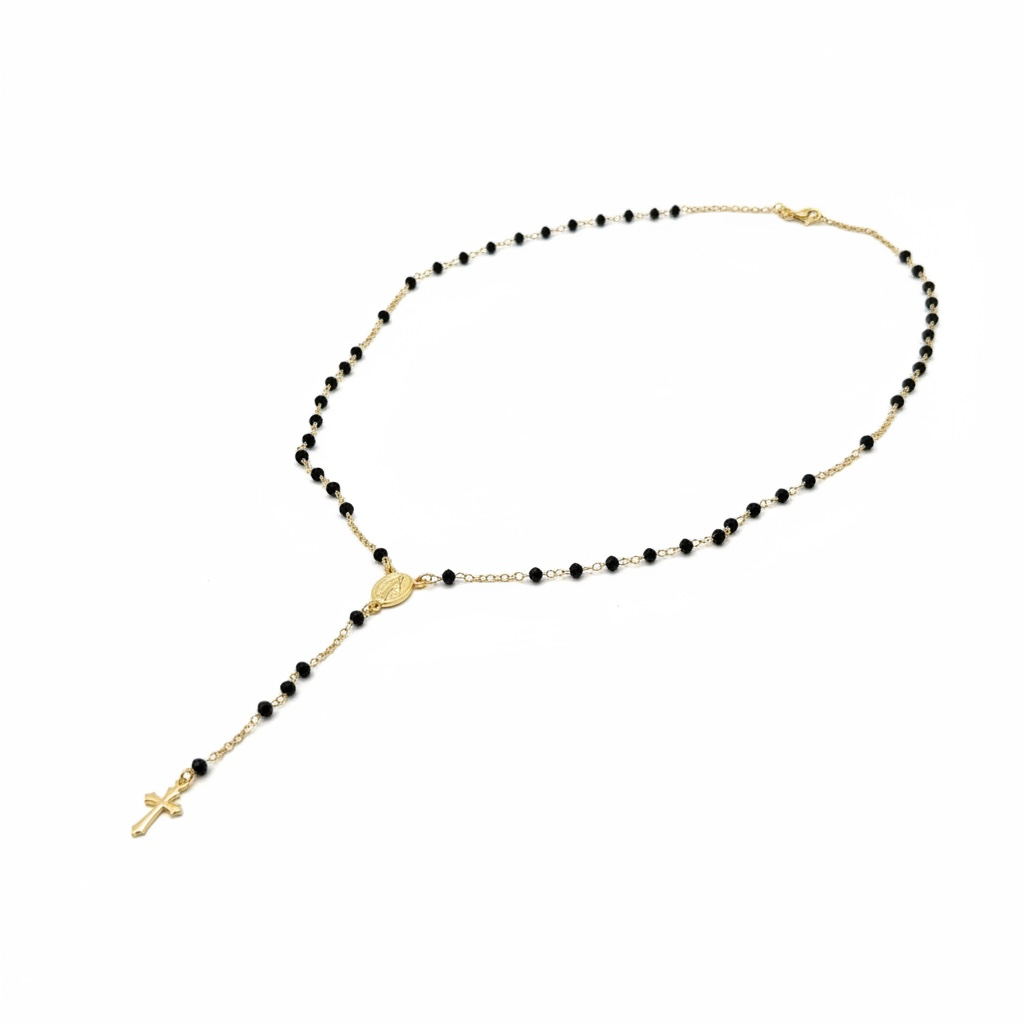Collana da donna in argento 925 modello rosario Y con sfere nere sfaccettate e croce pendente. Chiusura a moschettone