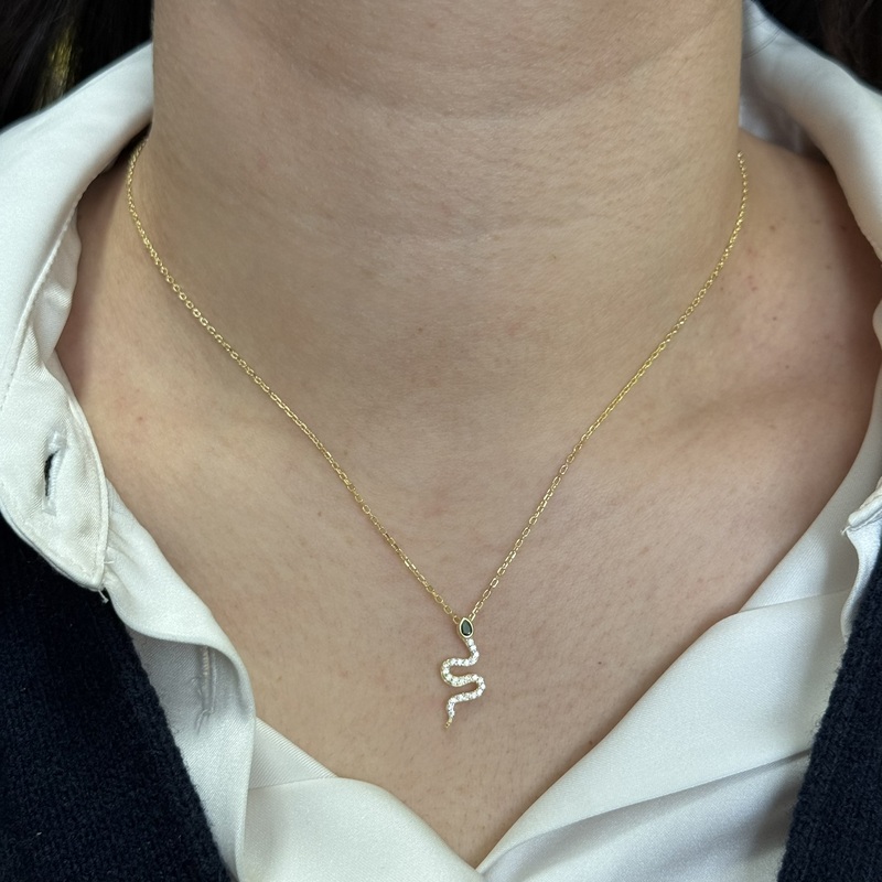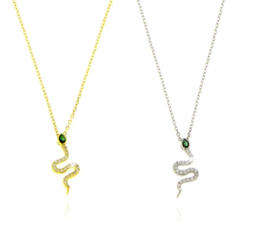 Collana da donna in argento 925 a forma di serpente con zircone verde e zirconi. Chiusura a moschettone.