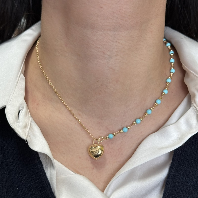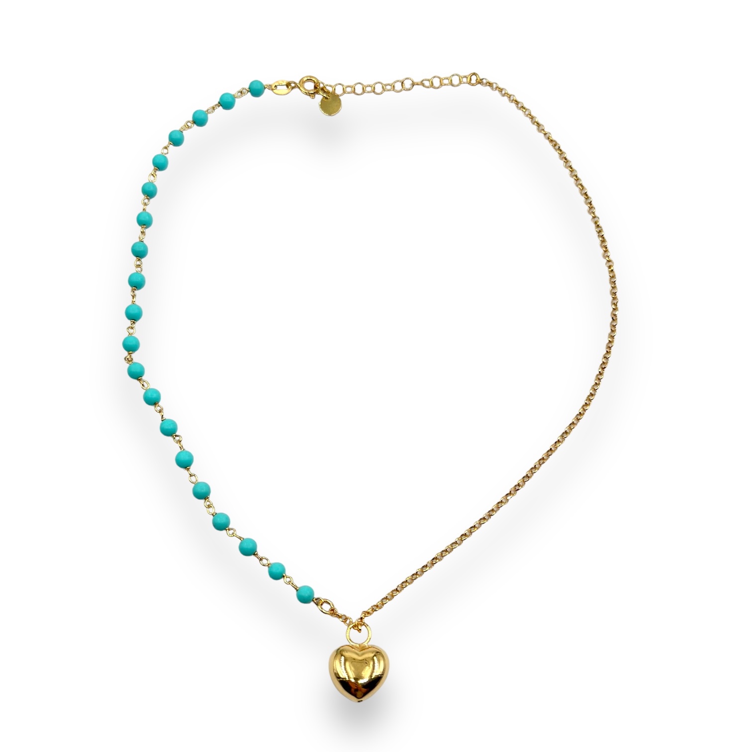 Collana da donna in argento 925 colore gold composto da sfere azzurre e cuore pendente. Lunghezza: 38 cm +3,5 cm di allungo. Chisura a molla regolabile