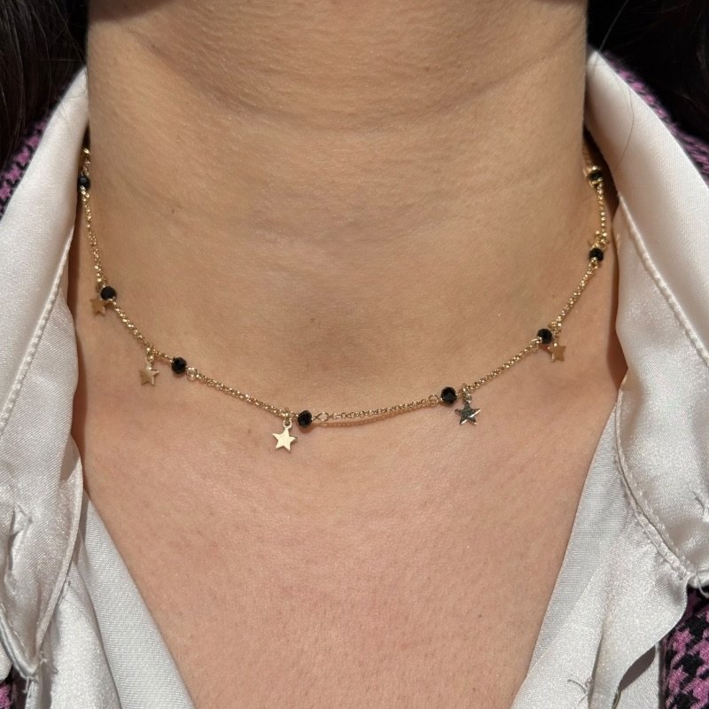 Collana da donna in argento 925 colore oro con stelline pendenti e sfere nere sfaccettate. Chiusura a moschettone regolabile.