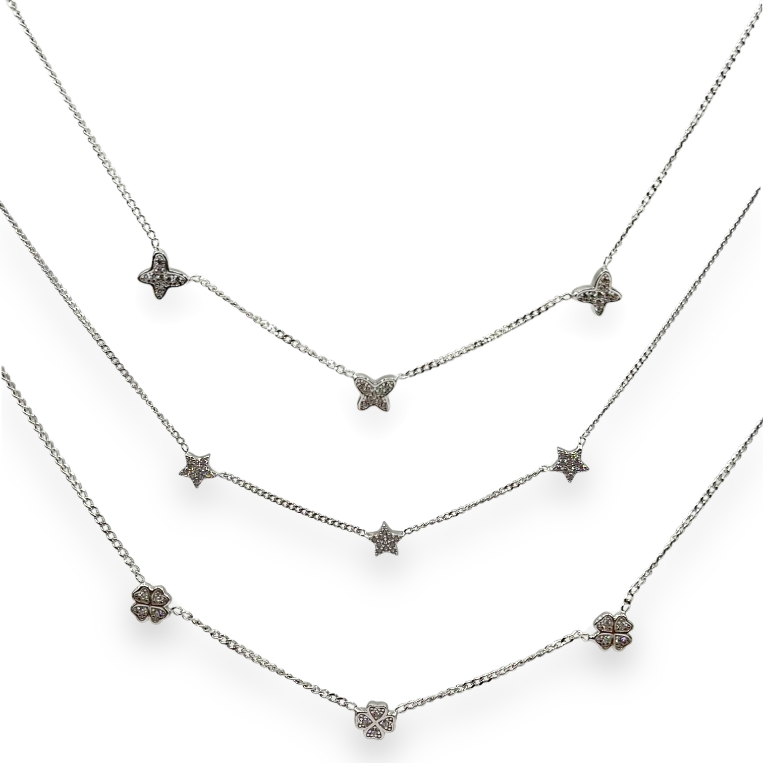 Collana da donna in argendo 925 con catena groumette e 3 elementi impreziositi da strass.Chiusura a moschettone regolabile. Misura: 42 cm + 4 cm di allungo