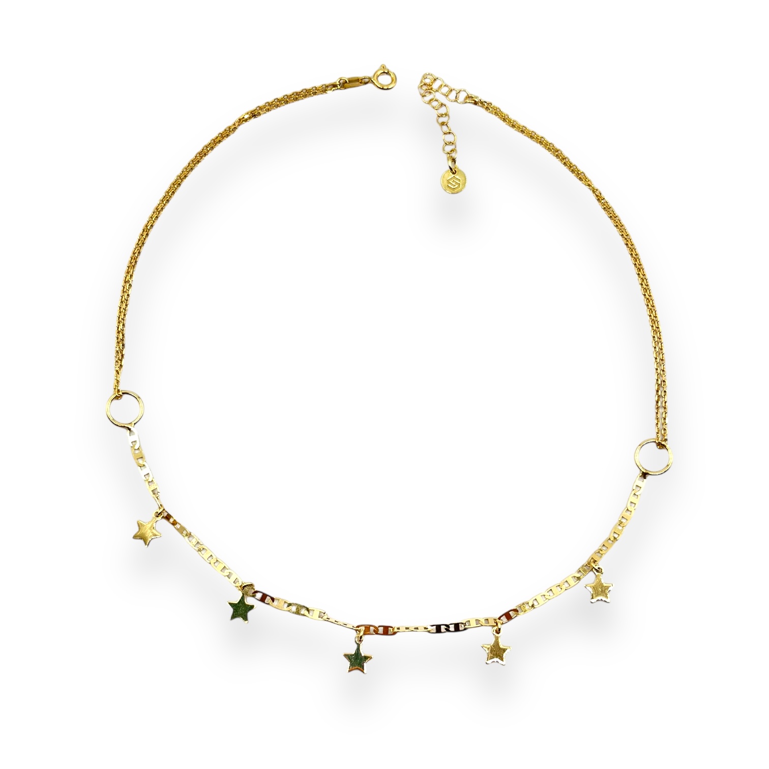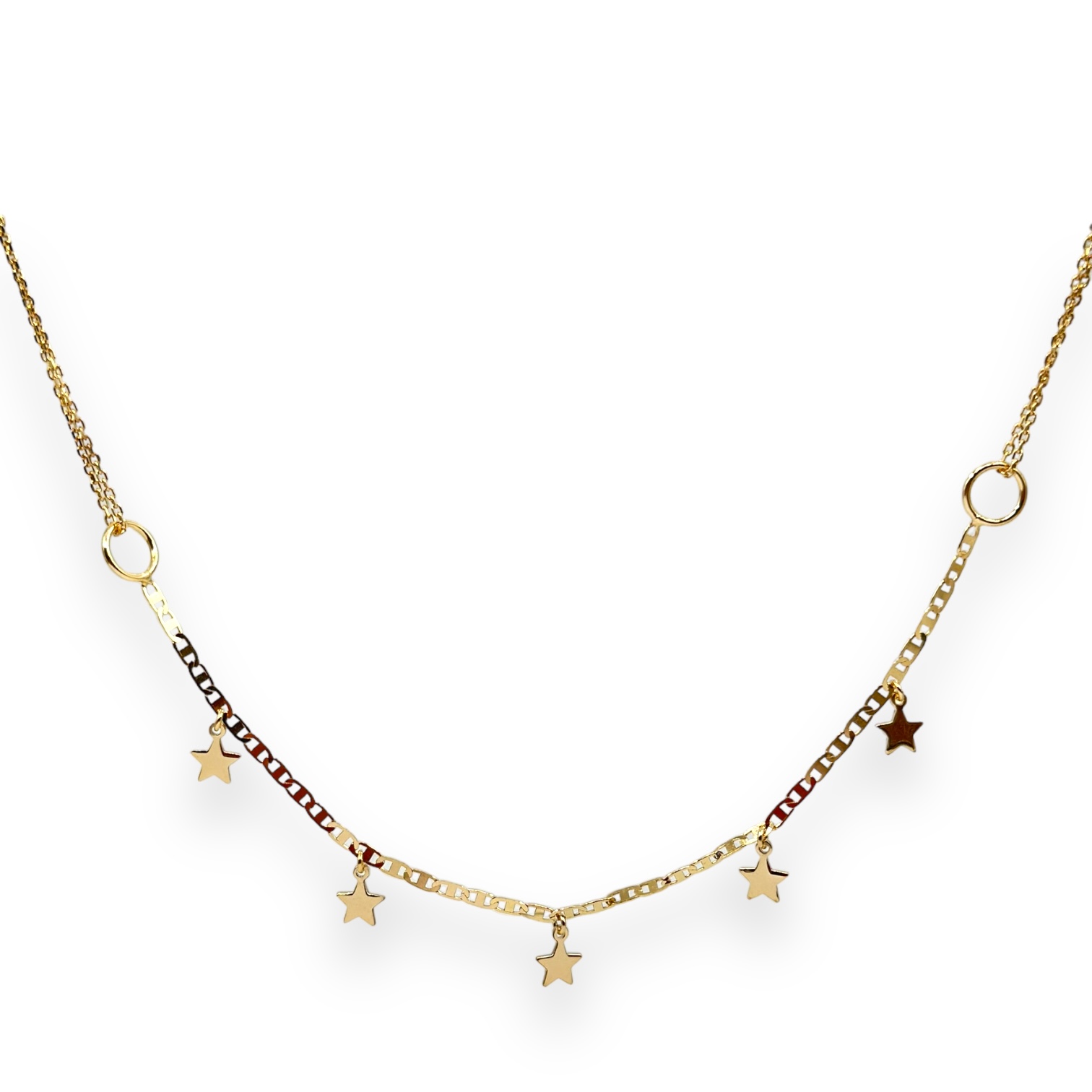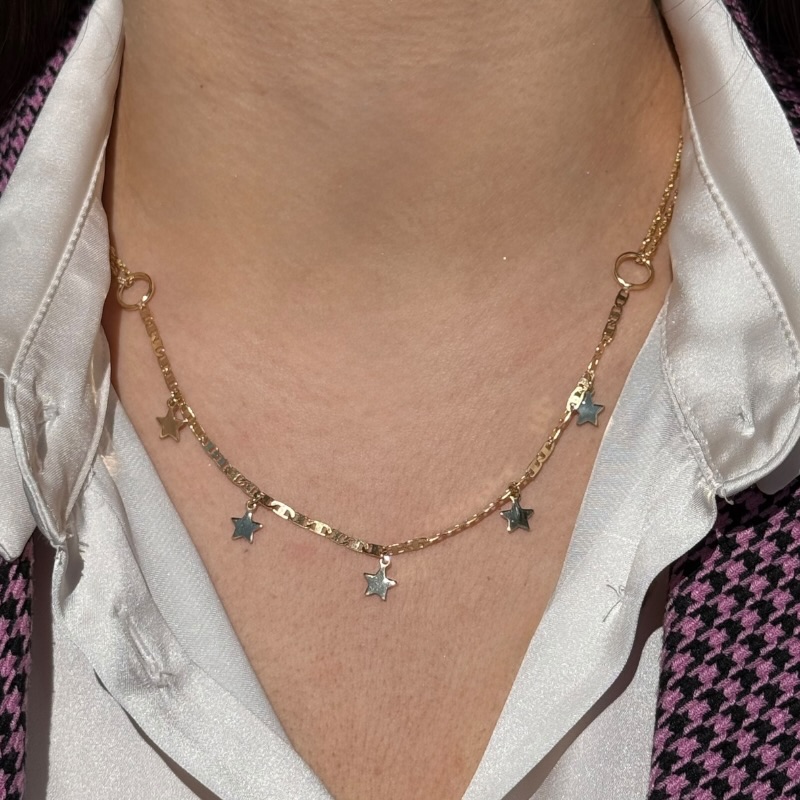 Collana da donna in argento 925 colore gold composto da doppia catena laterale con groumette centrale e 5 pendenti a forma di stella. Chiusura a molla regolabile. Misura, lunga 40 cm + 4,5 cm di allungo