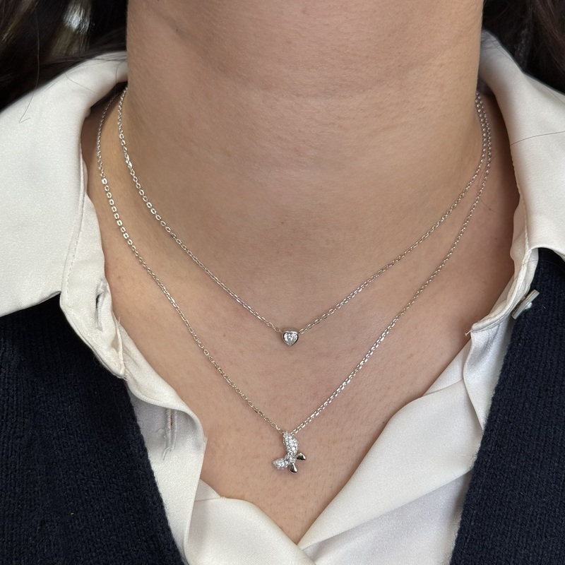 Collana in argento 925 composta da doppia catena con zircone a forma di cuore e catena con pendente a forma di fiocchetto zirconato. Chiusura a moschettone regolabile