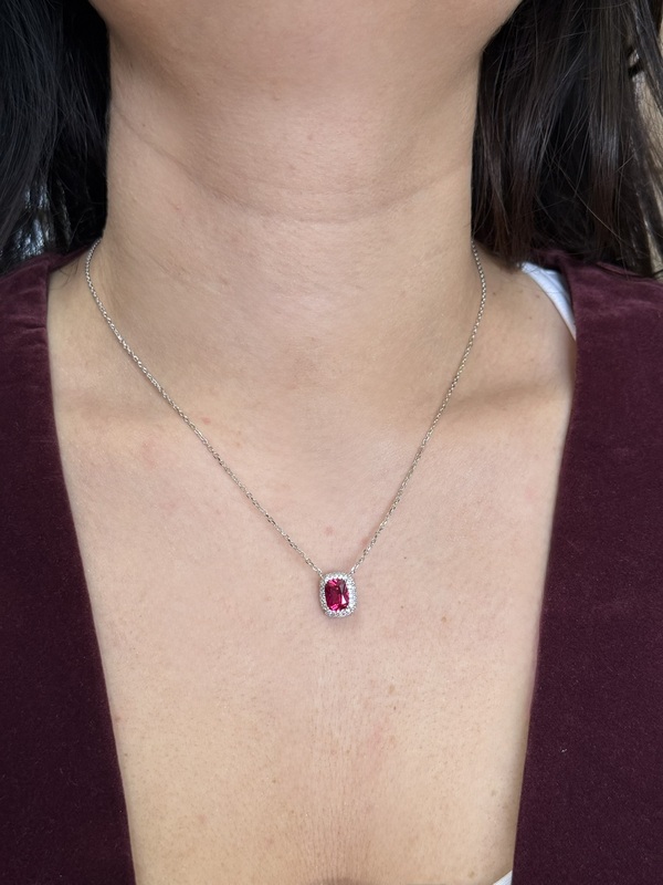 Collana da donna in argento 925 Con pendente rettanglare e impreziosito da giro di zirconi e zircone colorato. Chiusura a moschetone