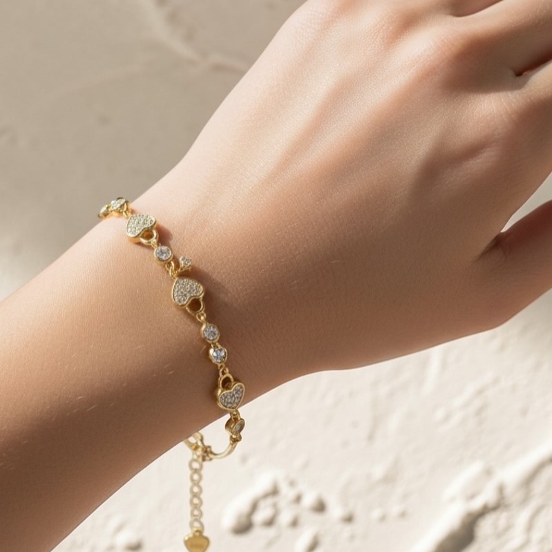 Bracciale femminile in argento 925 con 3 cuoricini zirconati e chiave pendente. Chiusura a moschettone regolabile