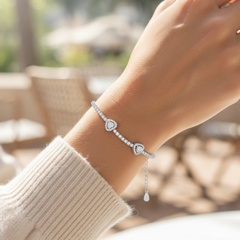 Bracciale da donna in argento 925 modello tennis con 3 cuori zirconati. Lunghezza 16 cm + 3 cm di allungo. Chiusura a moschettone regolbile