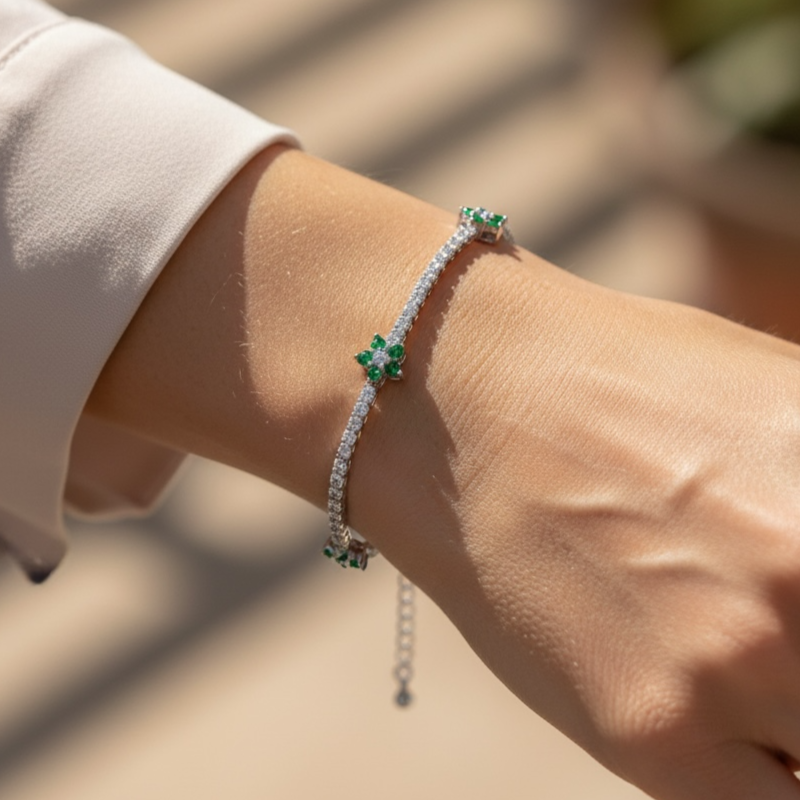 Bracciale da donna in argento 925 modello tennis con zirconi da 1,75 mm impreziositi da tre fiori colorati. Lunghezza 16 cm + 3 cm di allungo