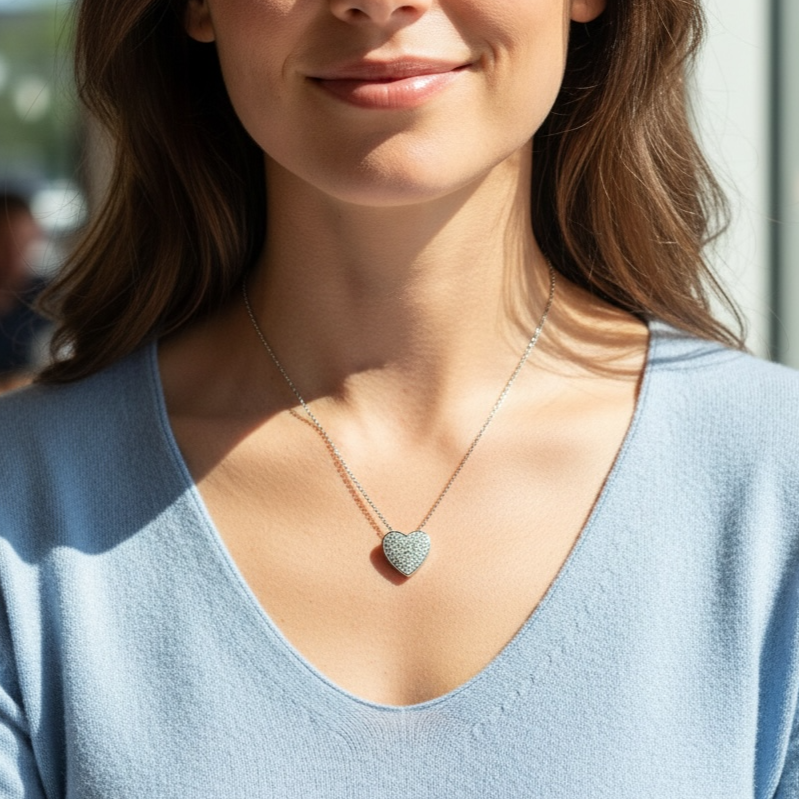 Collana da donna in argento 925 con cuore pendente impreziosito da pavèdi strass. Chiusura a moschettone regolabile