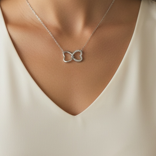 Collana da donna in argento 925 composto da cuori incrociati di cui uno zirconato. Chiusura a moschettone regolabile