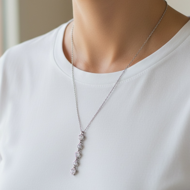 Collana da donna in argento 925 con pendenti alternati tra cipollini zirconati e cuori. Chiusura a moschettone regolabile