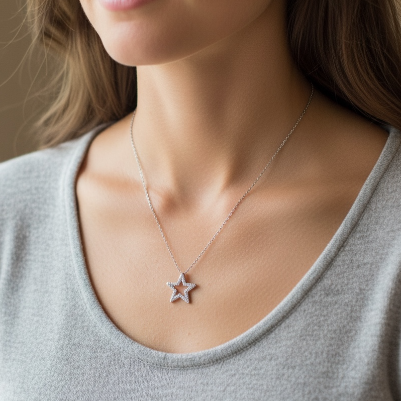 Collana da donna in argento 925 con stellina zirconta pendente. Chiusura a moschettone regolabile.