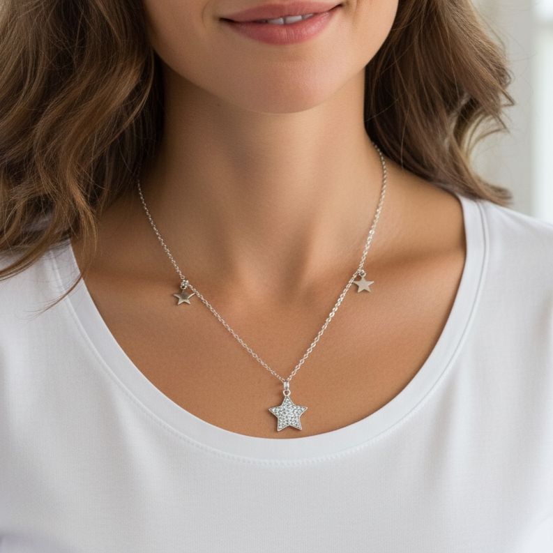 Collana da donna in argento 925 con forzatina e stelline con zirconi. Chiusura a moschettone regolabili