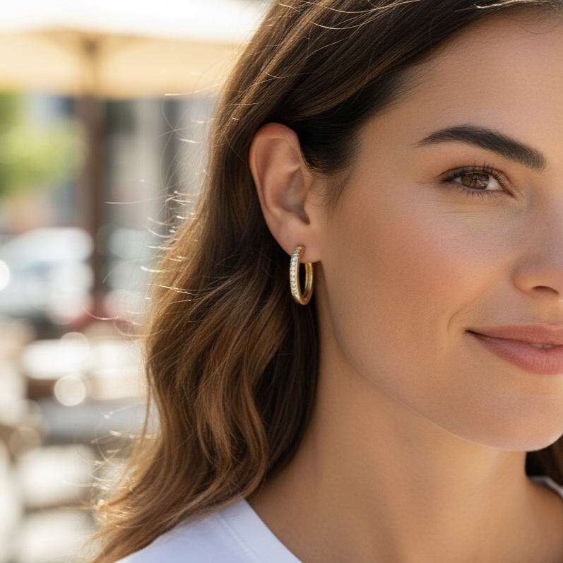 Orecchini da donna in argento 925 a cerchio impreziositi da zirconi. Diametro 18 mm. Chiusura a scattino