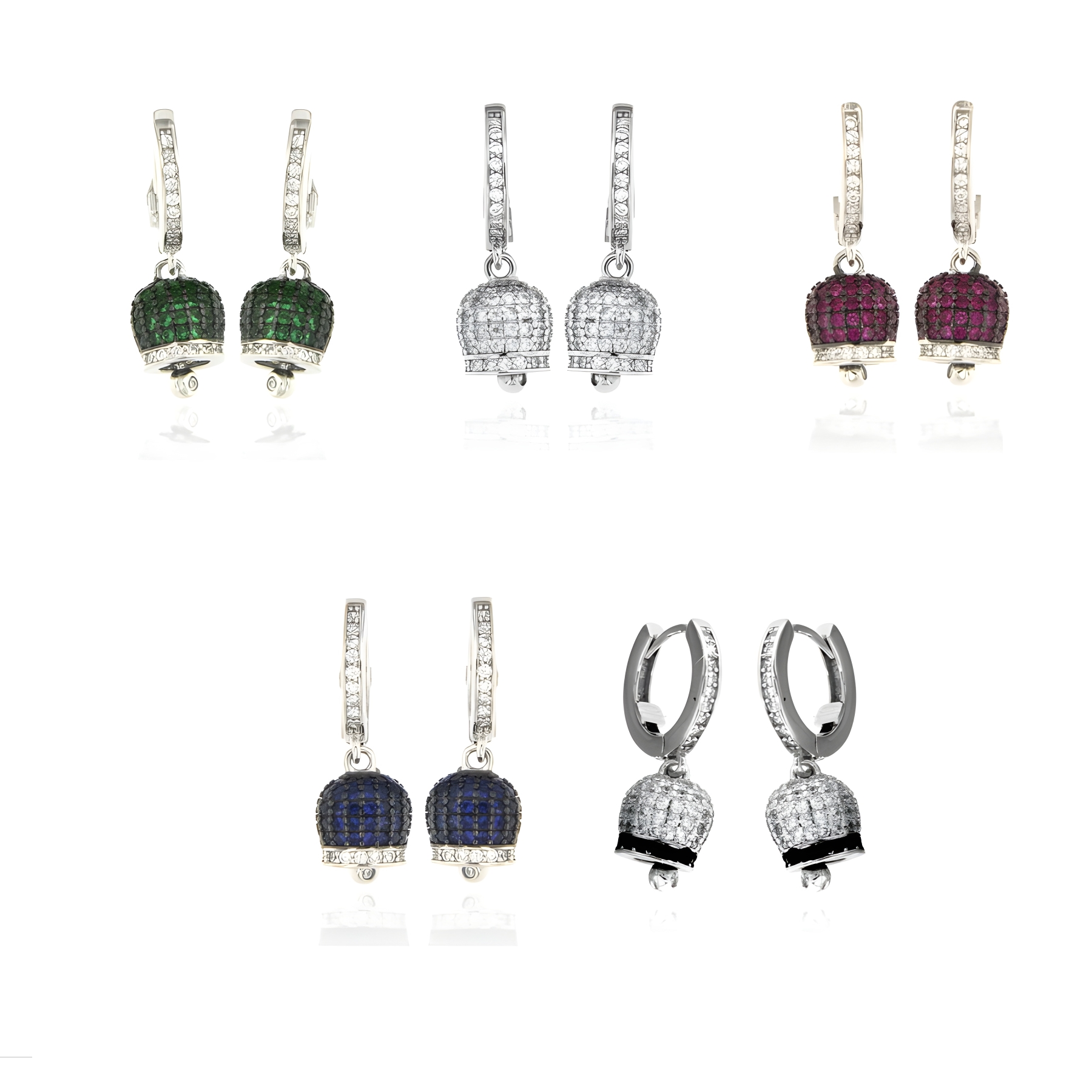 Orecchini da donna in argento 925 con pendente a forma di campana impreziosito da zirconi. Chiusura scatto.