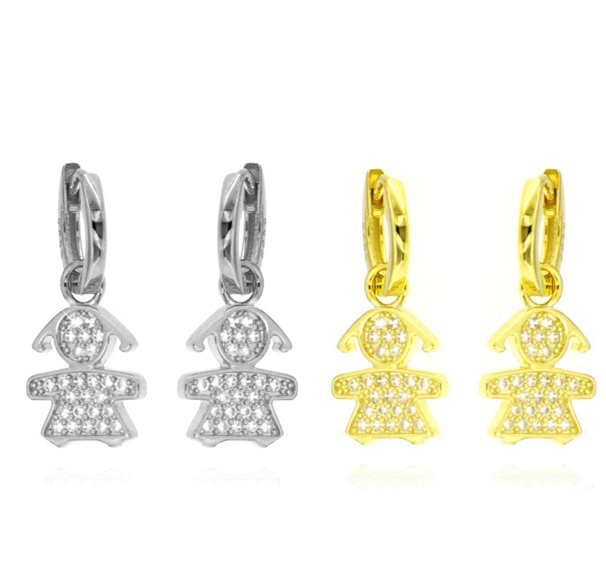 Orecchini da donna in argento 925 con charms a forma di bambina zirconato. Chiusura a scattino