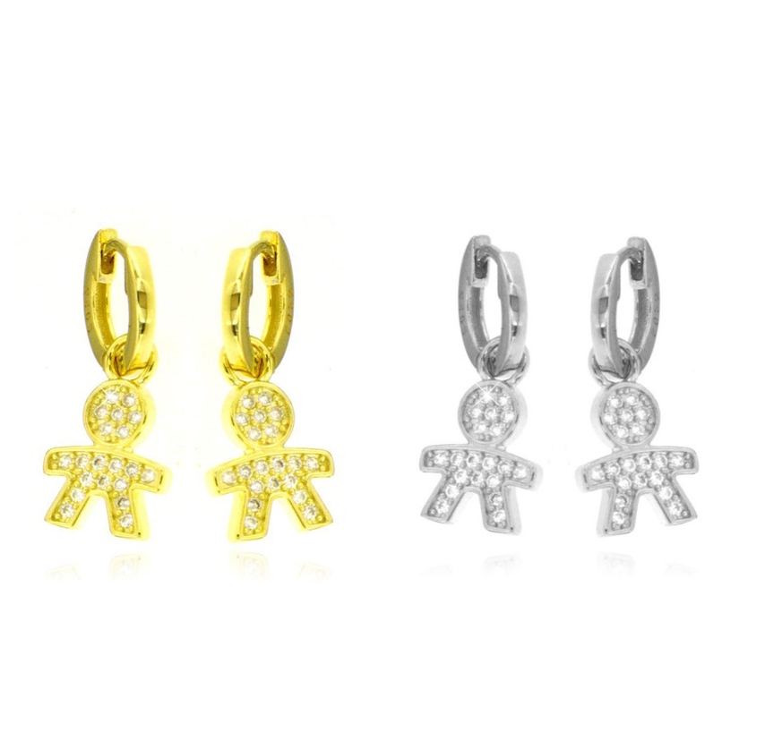 Orecchini da donna in argento 925 con charms a forma di bambino zirconato. Chiusura a scattino