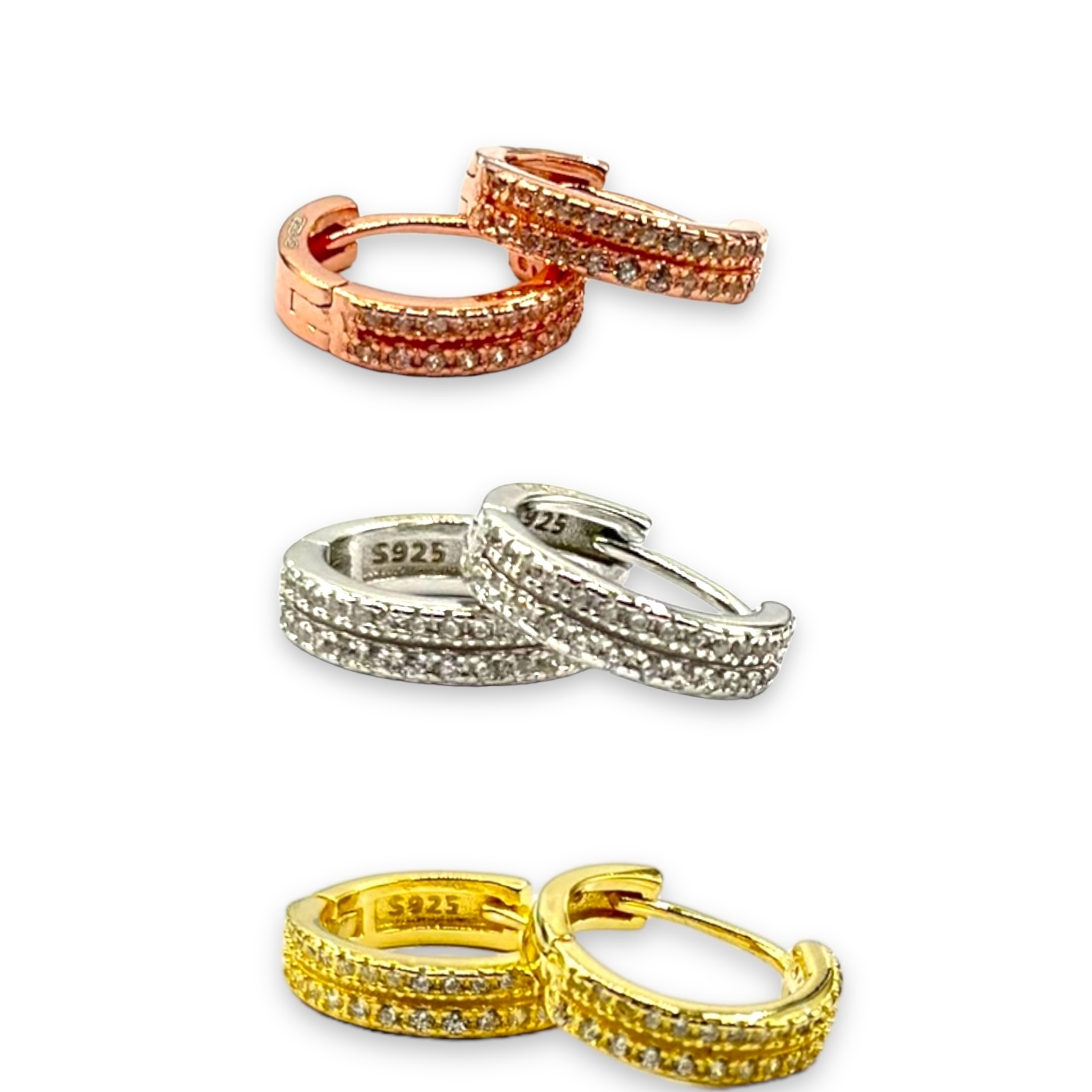 Orecchini da donna in argento 925, impreziosiositi da doppio giro di strass . Diametro 12 mm, chiusura con scatto a scomparsa.