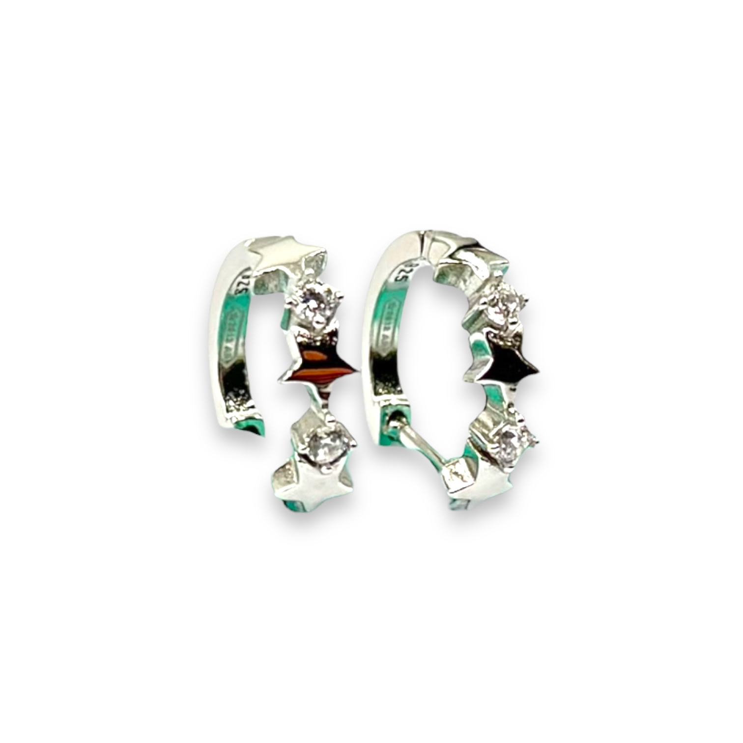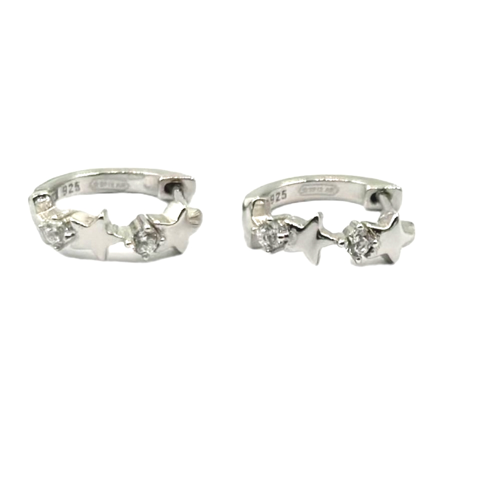 Orecchini da donna in argento 925 con cerchietto, stelline e strass. Chiusura con scatto a scomparsa. Diametro: 14 mm