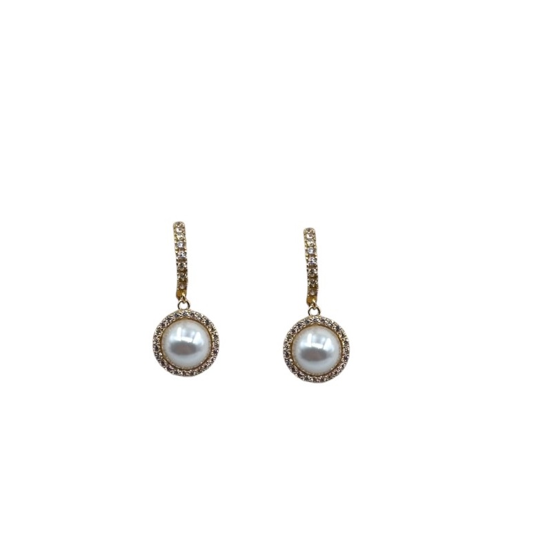 Orecchini da donna in argento 925 di colore oro, impreziositi da zirconi e perline. Chiusura a scattino
