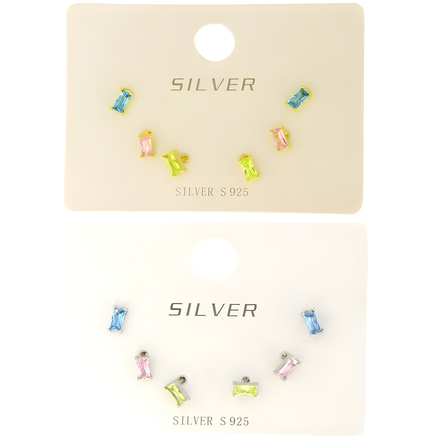 Blister composto da 3 coppie di orecchini rettangolari a 4 griffe, impreziosito da ziconi colorati. Chiusura a pernetto