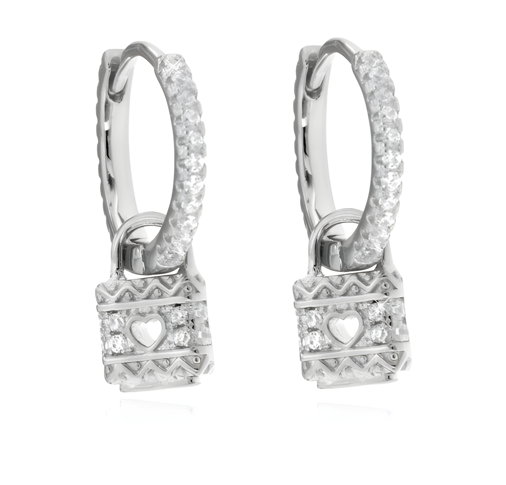 Orecchini da donna in argento 925 con pendente a forma di lucchetto impreziosito da zirconi. Chiusura scatto.