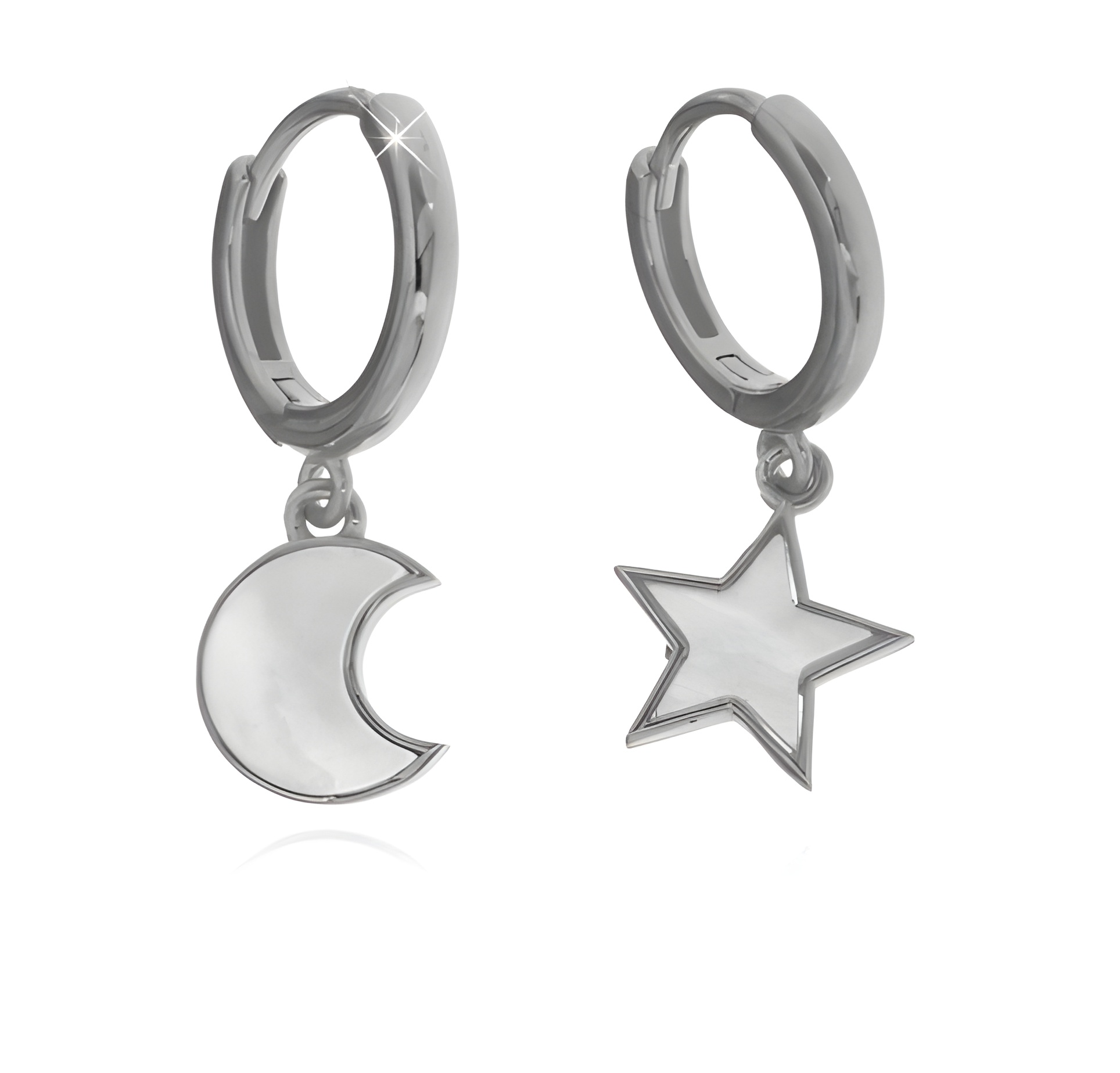 Orecchini da donna in argento 925 con pendente a forma di stellina e luna fondo madreperla. Chiusura scatto