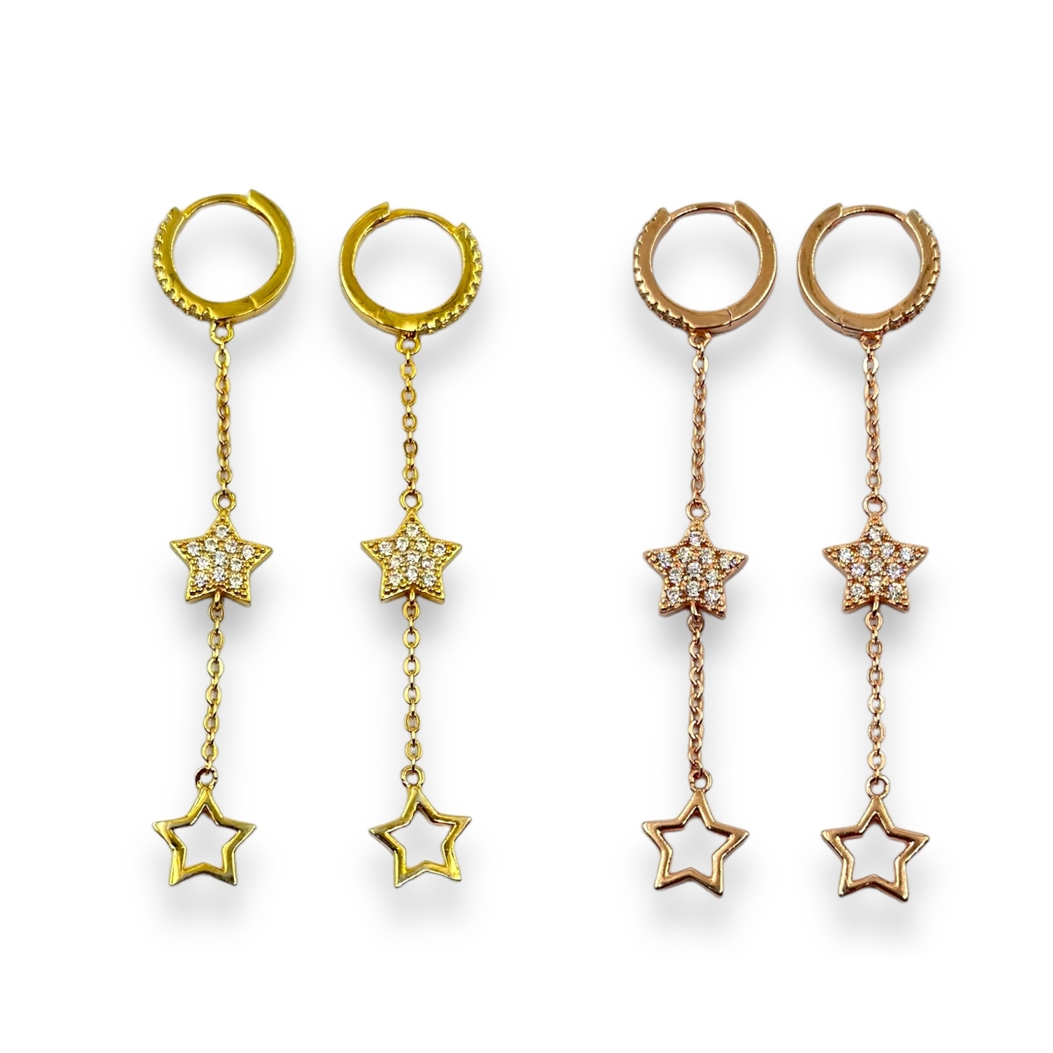Orecchini da donna in argento 925 con cerchietto impreziosito da strass e 2 pendenti a forma di stelle di cui una impreziosita da strass. Chiusura con scatto a scomparsa. Lunghezza totale: 67 mm
