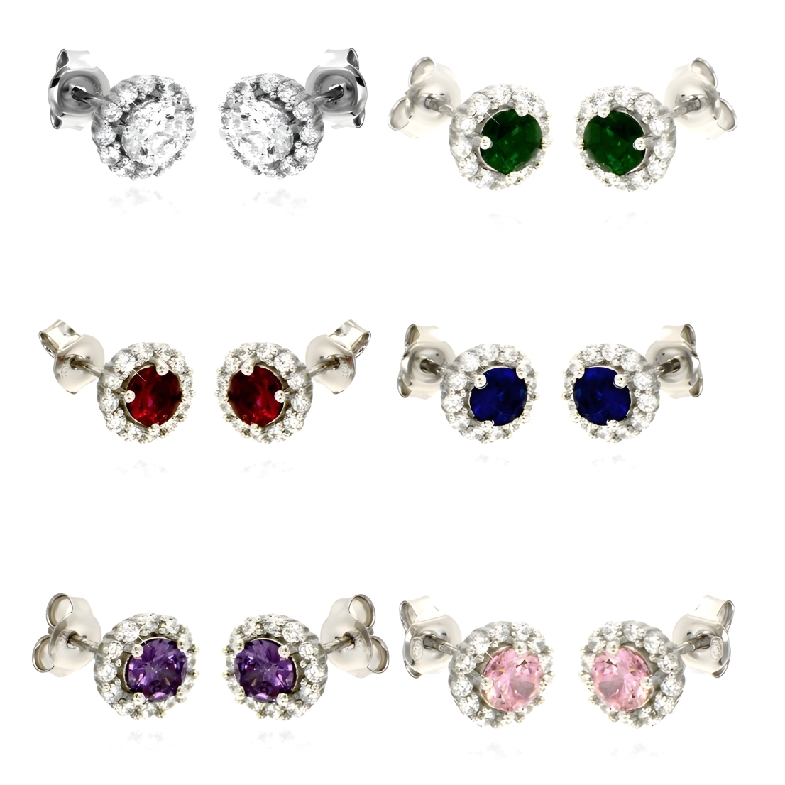 Orecchini da donna in argento 925 tondi impreziositi da cornice di zirconi. Chiusura a perno
