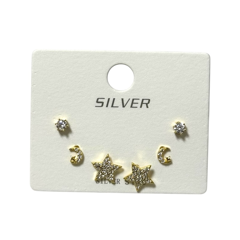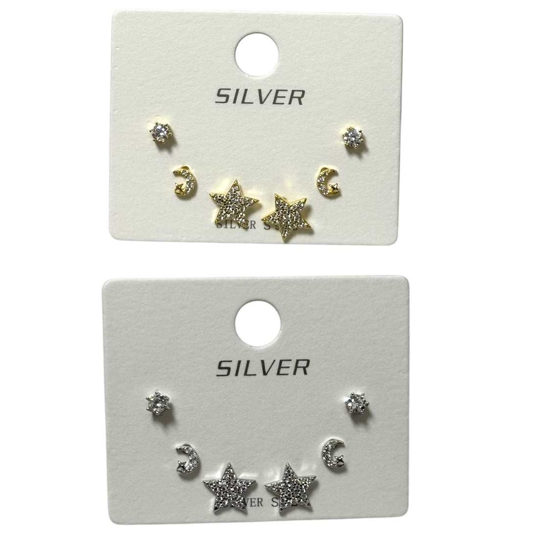 Set orecchini in argento 925 composto da stelline, lune e punti luce. Chiusura a pernetto
